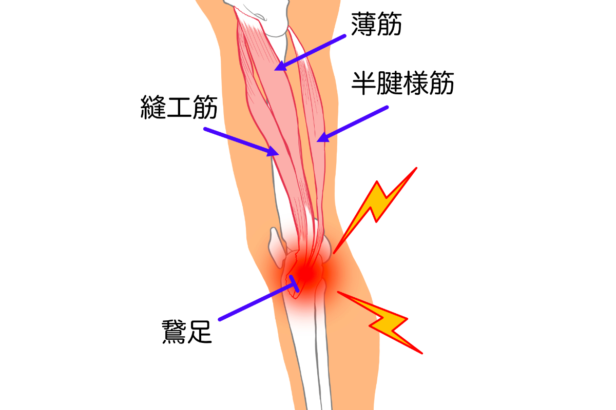 鵞足炎とは、膝の内側にある「鵞足」と呼ばれる部位に炎症が起こっている状態を言います。