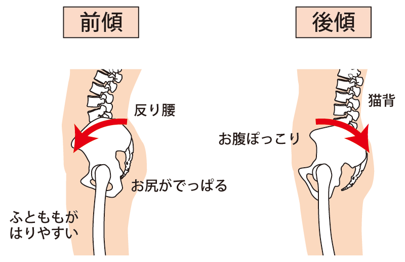 猫背は背中だけの問題ではありません。上のイラスト右側のように、骨盤に付着している「腸腰筋」という筋肉が上手く使えないことにより、骨盤が後ろに倒れてしまい結果として背中が丸くなってしまうのです。そのため、猫背の治療をする上で腸腰筋へのアプローチは大事なポイントになってきます。