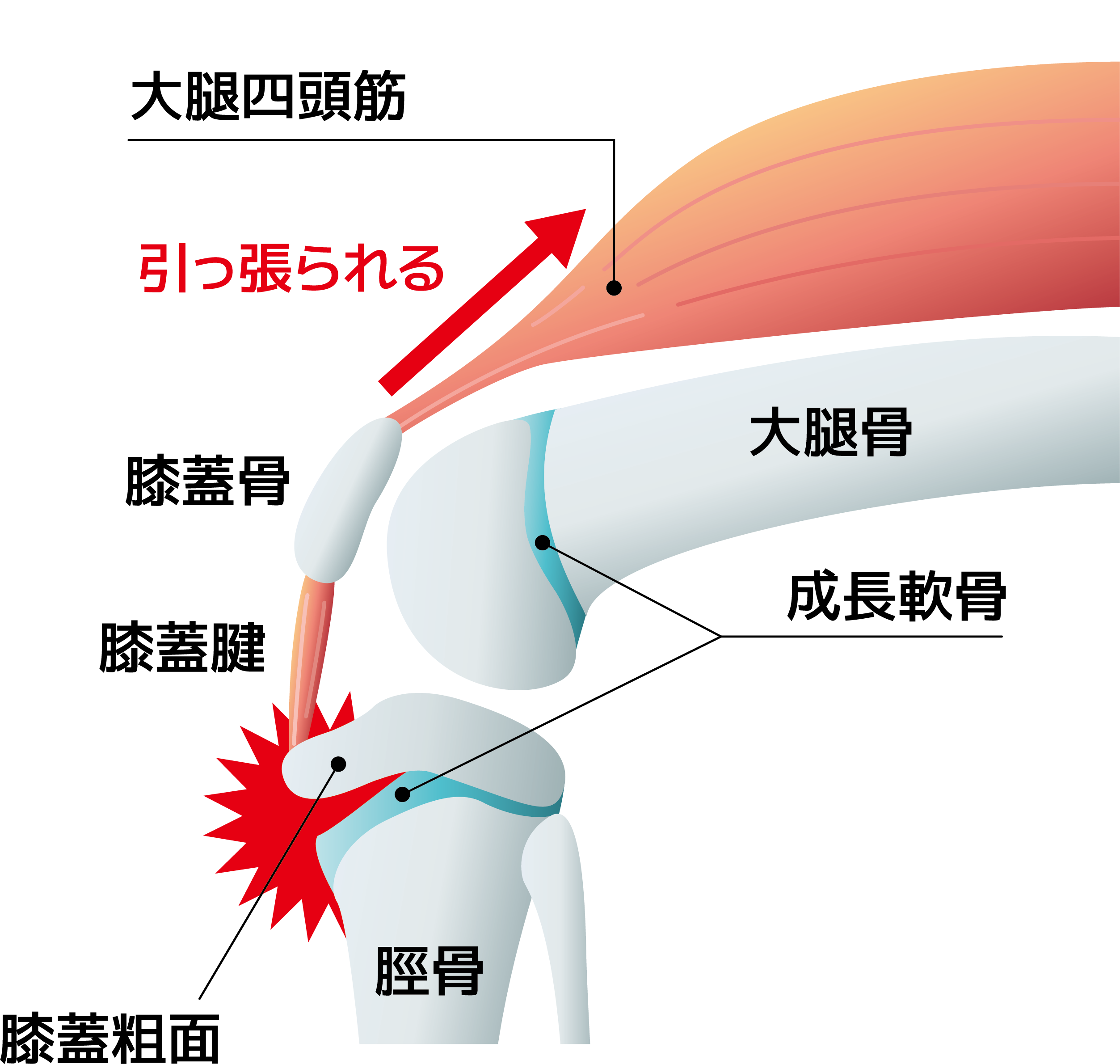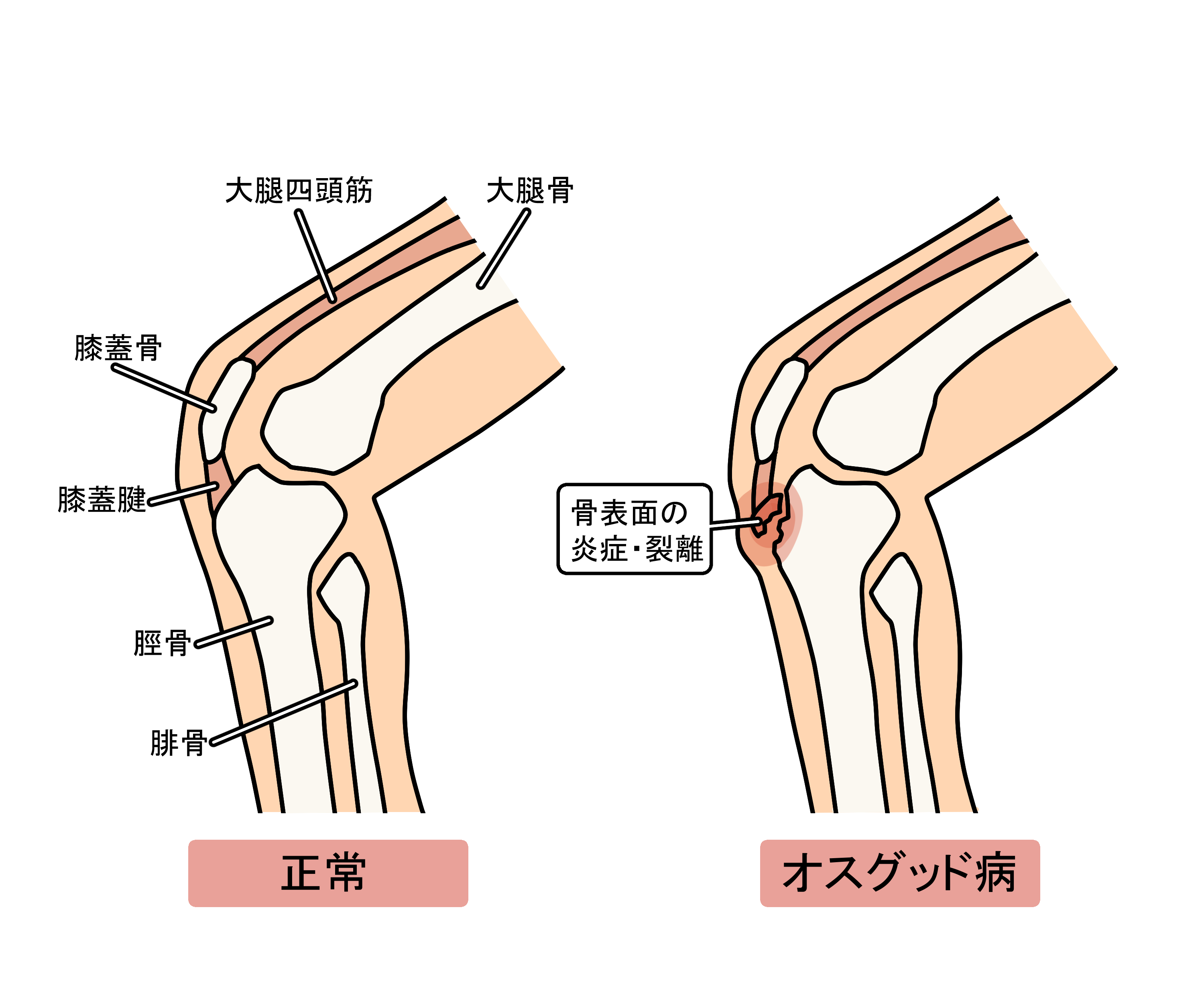 オスグッド病の主因は、大腿四頭筋の過剰な引っ張りが脛骨粗面(すねの上部)に繰り返しかかる負担です。サッカーやバスケットボールなど、頻繁にジャンプやダッシュを繰り返すスポーツ活動が発症リスクを高めます。