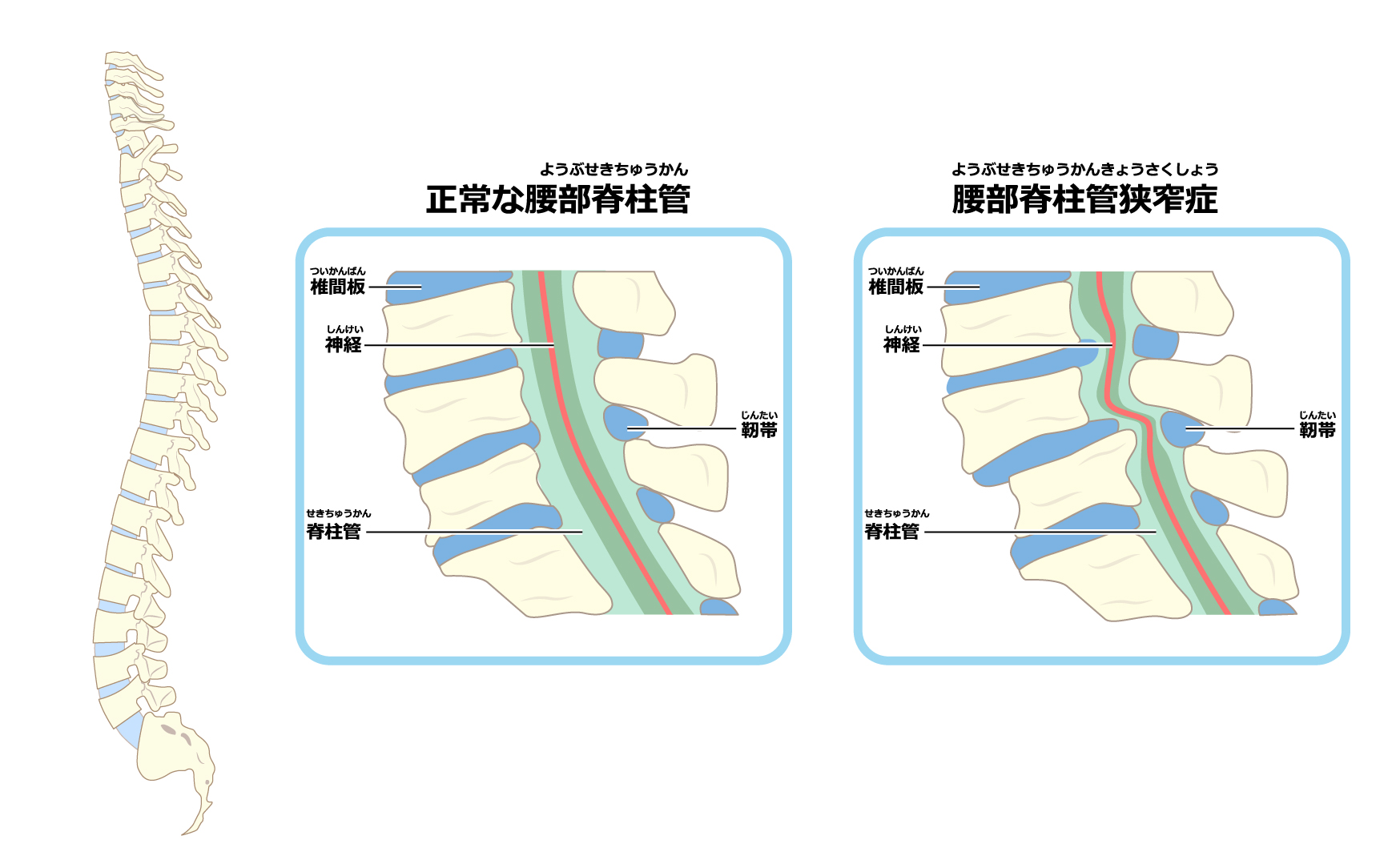 脊柱管狭窄症は、背骨の中を通っている「神経が圧迫」される事で起こる症状です。原因は加齢や労働、不良姿勢など多岐に渡ります。
