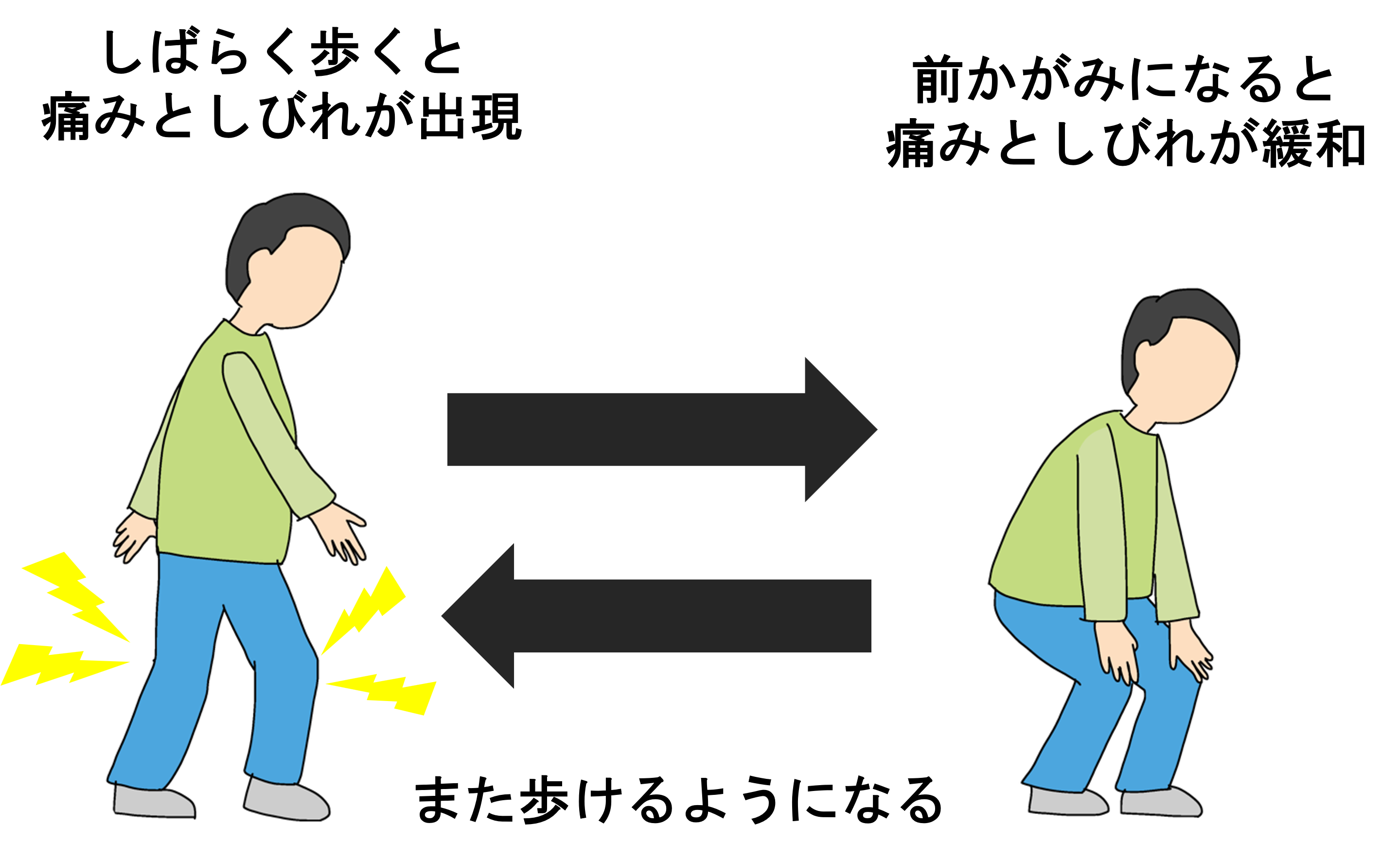 また、体を後ろに反らすと「脊柱管が狭く」なります。そのため背中を伸ばすと症状が悪化し、前かがみになると楽になるのも特徴です。